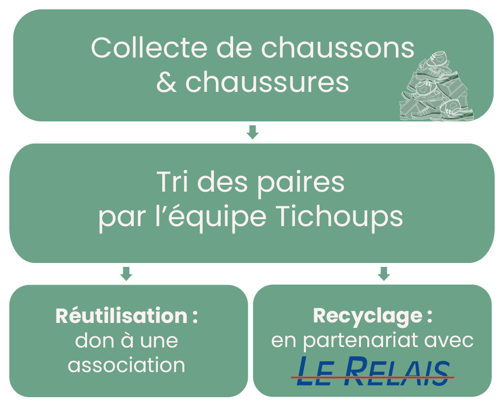 Usés, déchirés... Toutes les chaussures peuvent encore avoir une deuxième vie. Aujourd'hui en France, seulement 30% des vêtements produits sont recyclés. Nous avons donc choisi Le Relais, une entreprise d'insertion basée en France. La collecte, le tri, la revente ou le recyclage des textiles usagés sont leurs principales activités. Une fois la borne pleine, Le relais viendra récupérer les produits et s'occupera de les recycler.